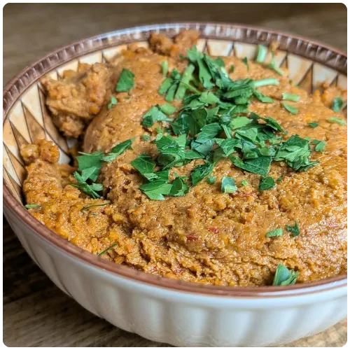 Roasted red pepper and walnut dip, sweetened with pomegranate molasses and spiced with shatta - contains saltine crackers)