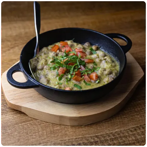 Lightly mashed fava beans mixed with green sauce made of olive oil, lemon, garlic, jalapeno and salt, topped with tomatoes and parsley