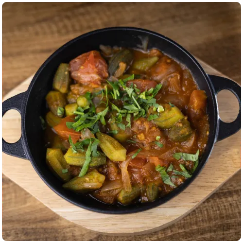 Baby okra slowly simmered in a flavorful tomato sauce with fried garlic