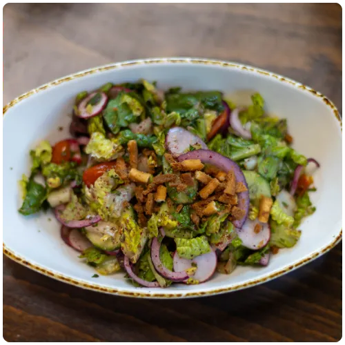 Romaine lettuce, tomatoes, cucumbers, radishes, red onions, olives, and mint tossed with sumac dressing, topped with toasted pita chips