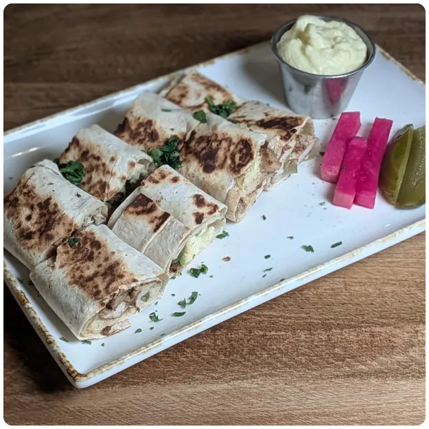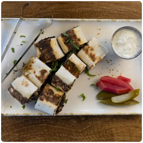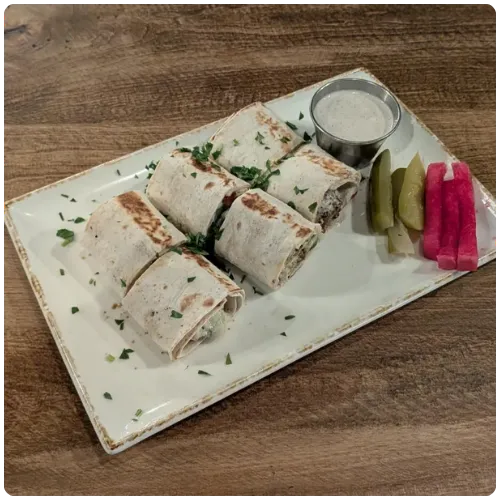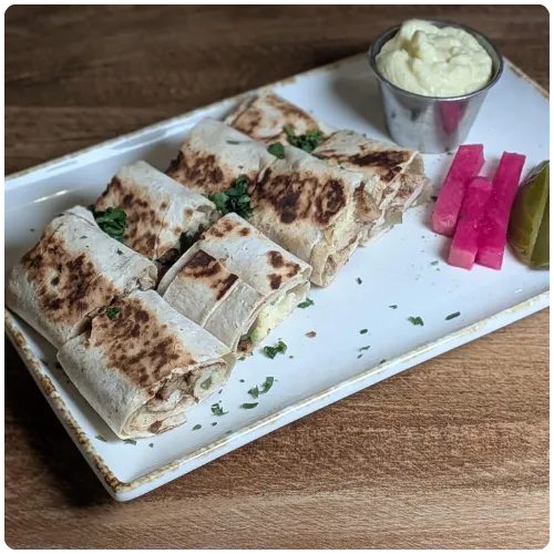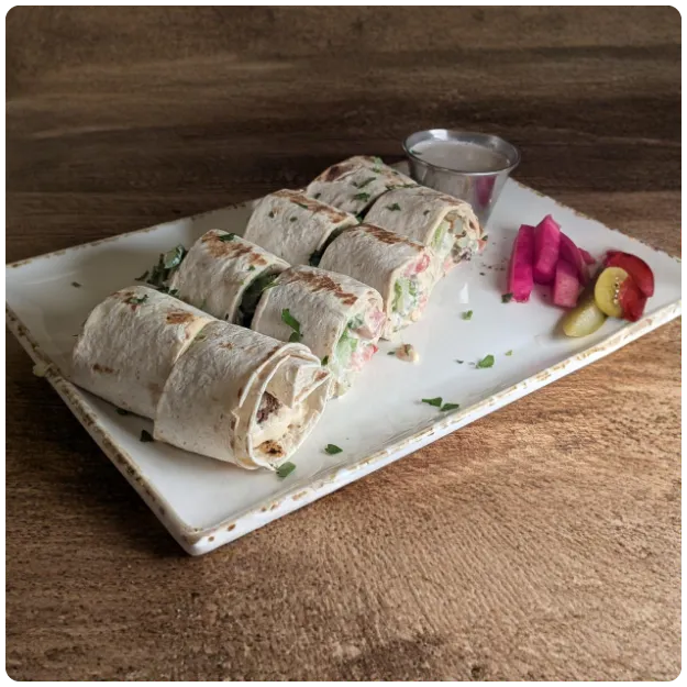 (Wrapped in Lavash flatbread, grilled on each side for a toasted texture, and sliced to share)