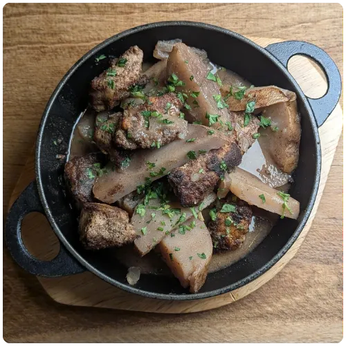 Mushrooms, onions, and sumac sautéed with olive oil, served with vegan tzatziki sauce (cashew based yogurt with cucumbers, mint, and garlic)