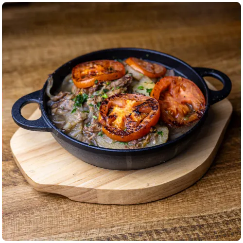Ground beef and lamb mixed with onions, parsley, and Mediterranean spices, baked with potato slices and onions, topped with your choice of a tahini sauce or tomato sauce