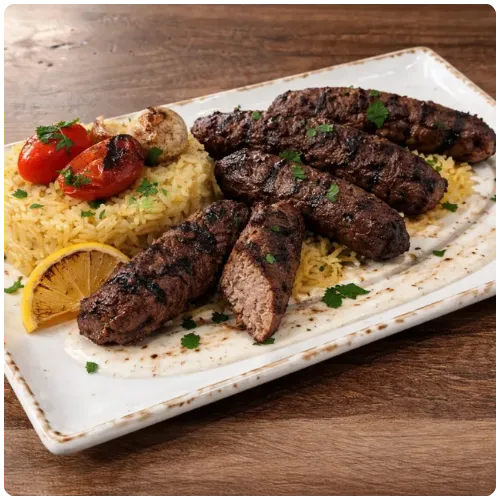 Ground beef and lamb kabob links mixed with onions, parsley, and Mediterranean spices served with house sumac tahini sauce