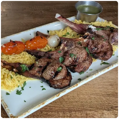 4 grilled lamb chops served with house spicy tatbili sauce (walnuts, jalapeno, cilantro, parsley, olive oil, lemon)