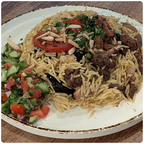 Traditional spiced (flavorful, not spicy) rice dish with roasted eggplant, potatoes, and cauliflower, topped with slices of grilled tomatoes, slivered almonds, served with tzatziki and a chopped tomato cucumber salata