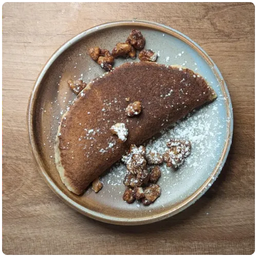 Baked “crepe” stuffed with walnuts and cinnamon drizzled with house syrup and caramelized walnuts - thicker than a traditional pancake - cooked on one side, stuffed with caramelized walnuts, folded over, then baked. Finished with house syrup and topped with powdered sugar, simple syrup, and more candied caramelized walnuts