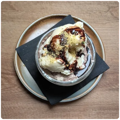 Sweet tahini dessert (V) served with vanilla ice cream drizzled with chocolate syrup, sweet tahini sauce, and topped with chopped pistachios