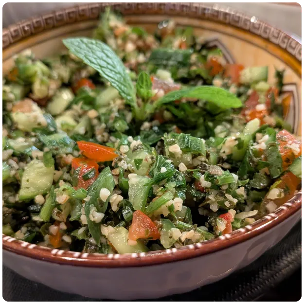 Chopped parsley, bulgur, tomatoes, cucumbers, and mint with Mediterranean dressing (lemon, olive oil and garlic)