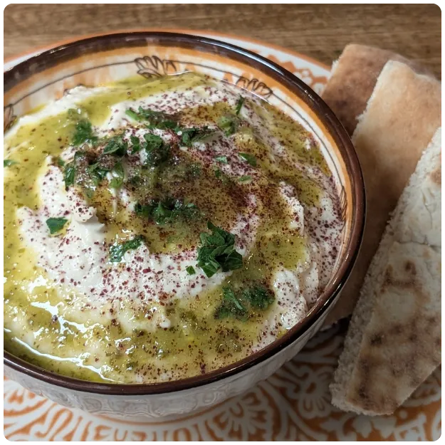 Chickpea tahini spread, drizzled with green sauce made of olive oil, lemon, garlic, jalapeno and salt, garnished with sumac and parsley