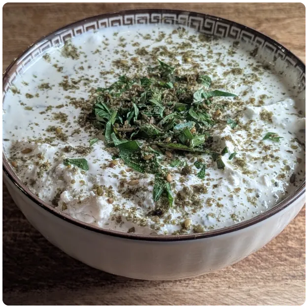 Yogurt-based “cream cheese” spread mixed with mint and garlic, sprinkled with za’atar (herb/spice blend with sesame seeds)