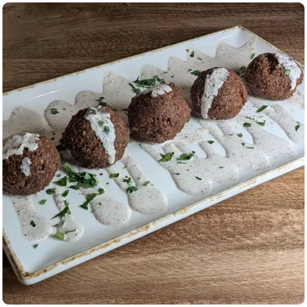 Seasoned deep-fried chickpea balls served on top of a tahini sauce (5 pieces)