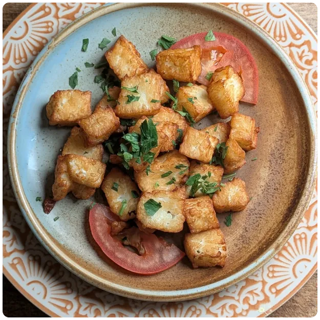 Fried Mediterranean brined white cheese (salty, slightly tangy taste and a distinctive "squeaky" texture when eaten)