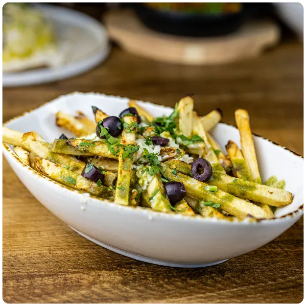 Homemade French fries topped with olives, feta, and drizzled with a tangy garlic jalapeno oil