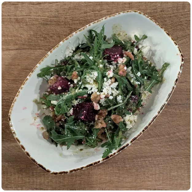 Roasted beets and arugula tossed in a citrus dressing, topped with crumbled feta and walnuts