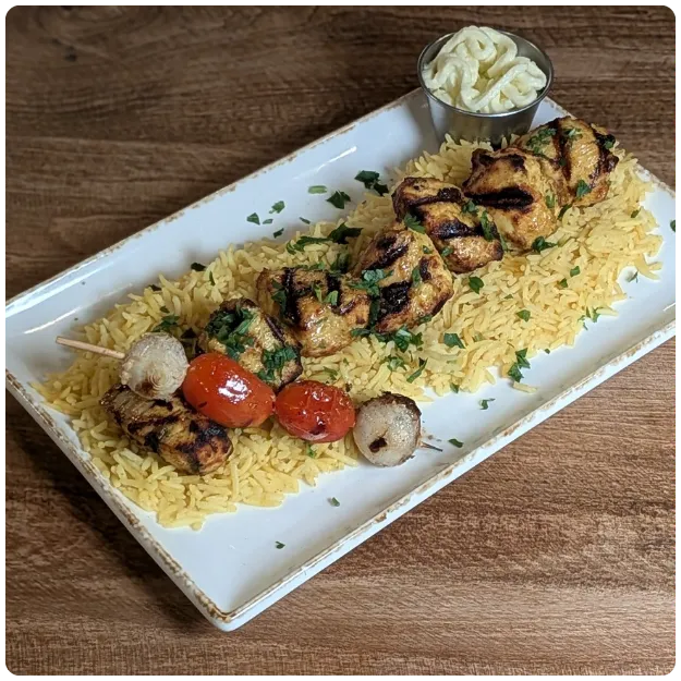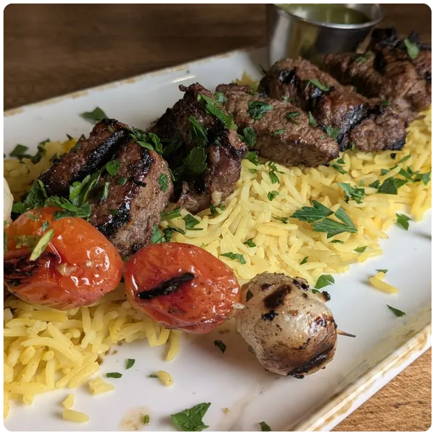 Served on a bed of basmati rice with a grilled pearl onion and tomato skewer (2 onions and 2 tomatoes)