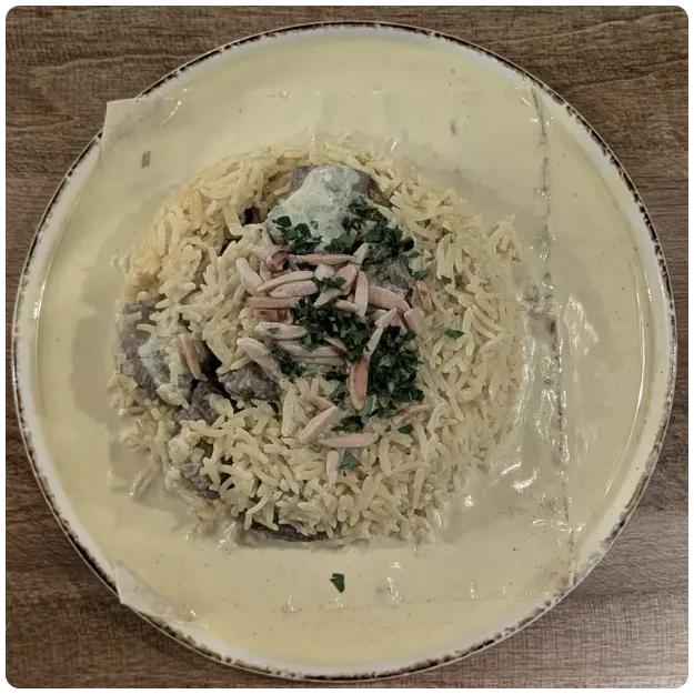 Spiced lamb mixed with basmati rice and yogurt sauce - jameed (a type of fermented and dried yogurt, traditionally made from ewe's or goat's milk, often shaped into balls and dried in the sun), topped with toasted almonds, served on lavash bread and extra jameed