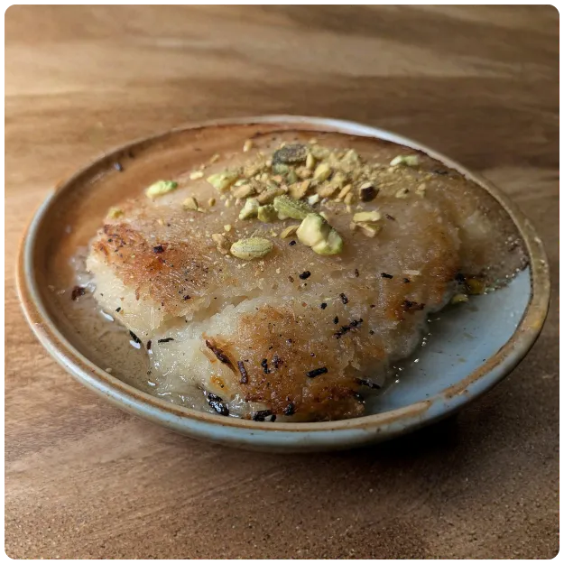 A layer of shredded phyllo dough, then a layer of mild white cheese, then another layer of shredded phyllo dough. Baked, then drizzled with house syrup and pistachio nuts