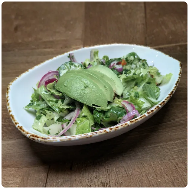 Cucumbers, tomatoes, parsley, and red onions tossed with romaine lettuce and arugula in our house dressing, topped with avocado slices